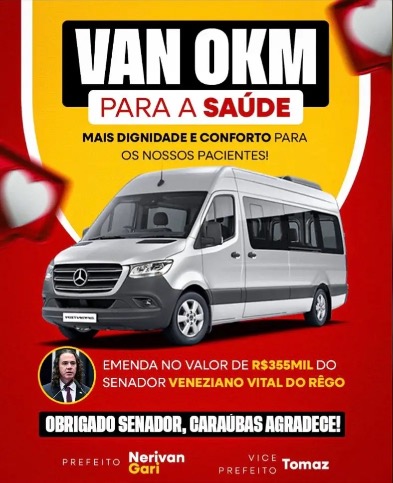 O município de Caraúbas recebeu um importante reforço para a área da saúde. A cidade foi contemplada com uma nova van destinada ao transporte de pacientes, adquirida por meio de uma emenda parlamentar no valor de R$ 355 mil do senador Veneziano Vital do Rêgo.